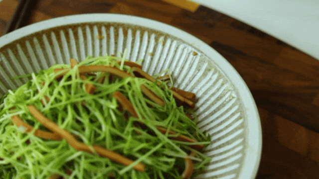 瞧瞧这盘菜的颜值,嫩生生的松柳苗像是刚摘下的春天,翠得能掐出水来。缜密的豆干丝穿插其中,像给翡翠撒了层碎玉。点睛之笔是黄灿灿的蒜末油,在绿意里泛着琥珀光,这配色往桌上一摆,特殊吸睛!