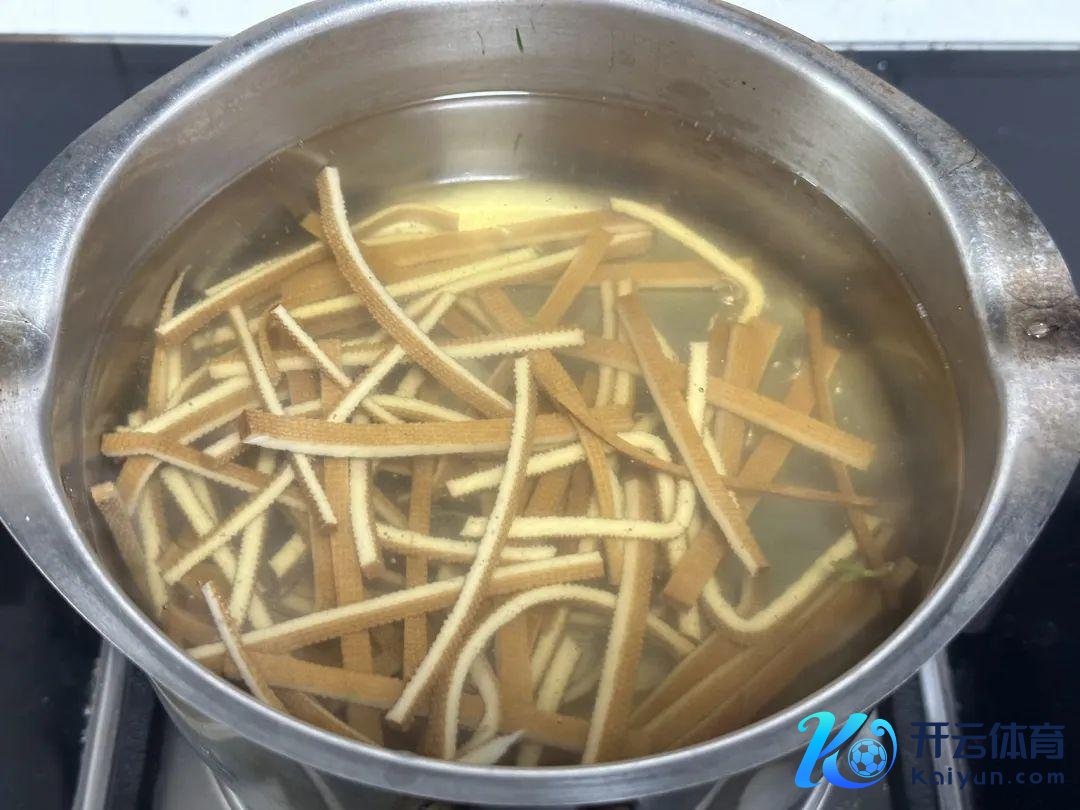 3、把豆干细丝,热水下锅也焯水1-2分钟傍边,捞出来沥干水分备用;