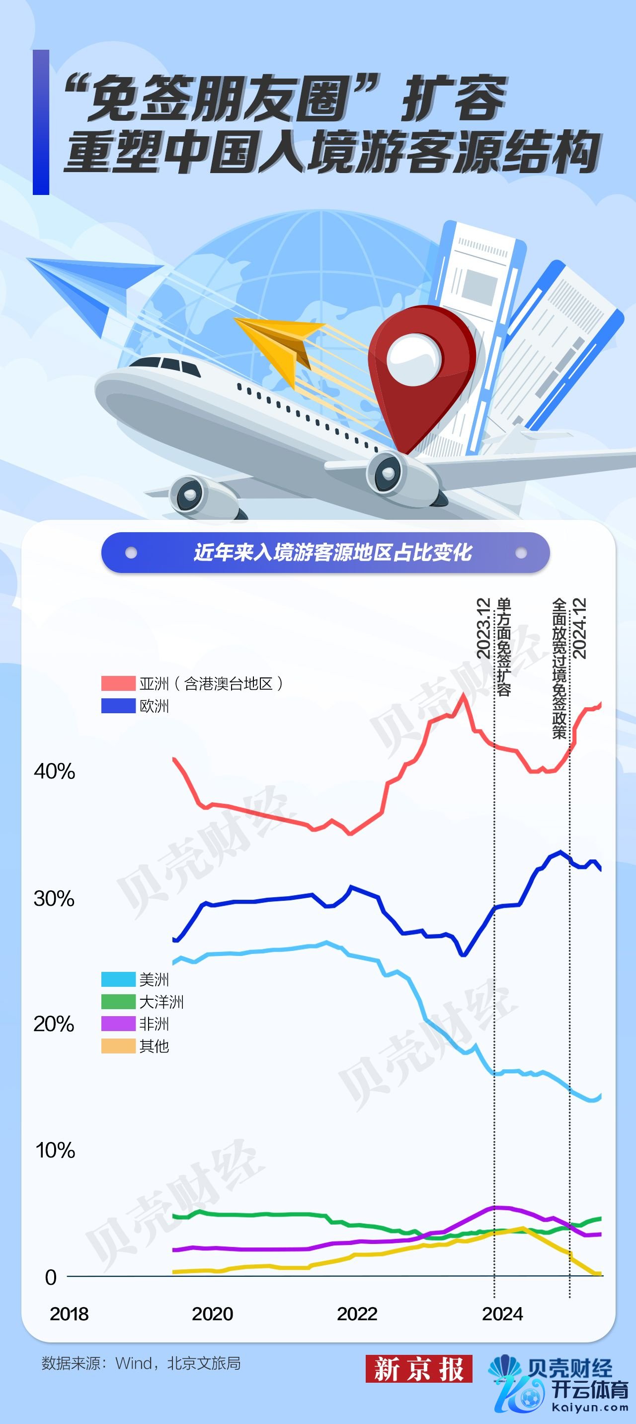 看成入境游最热点的“狡计肠”之一,北京的入境游客数据印证了这一变化。新京报贝壳财经记者梳理北京文旅局、Wind数据发现,亚洲与欧洲客源市场正瓜代成为入境游的主要增长引擎,好意思洲客源占比则大幅下滑。具体来看,2024年头,欧洲市场因片面免签快速建树,占比上升;2024年11月起,中国先后对韩国、日本引申片面免签,并于12月17日全面放宽过境免签,进一步开释亚洲近程市场需求,使其占比快速提高。