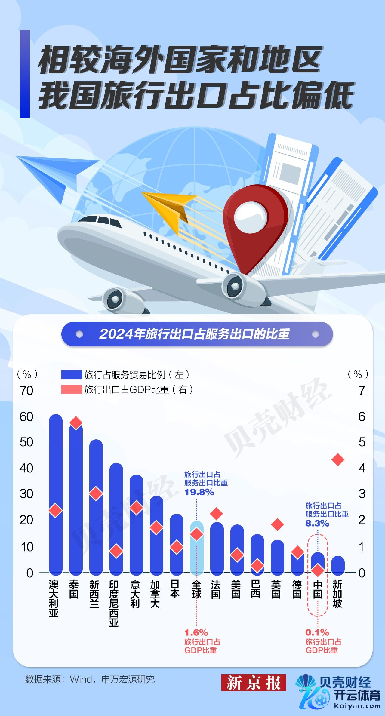 国度统计局数据泄露,本年一季度,中国个东谈主、文化和文娱干事出口占GDP比重已升至0.015%,较2019年提高近1个基点。但从专家对比看,中国的旅游干事出口仍有较大发展空间。申万宏源络续论说指出,2024年,中国旅行出口占干事出口比重为8.3%,占GDP比重0.1%,显贵低于专家平均水平19.8%和1.6%。