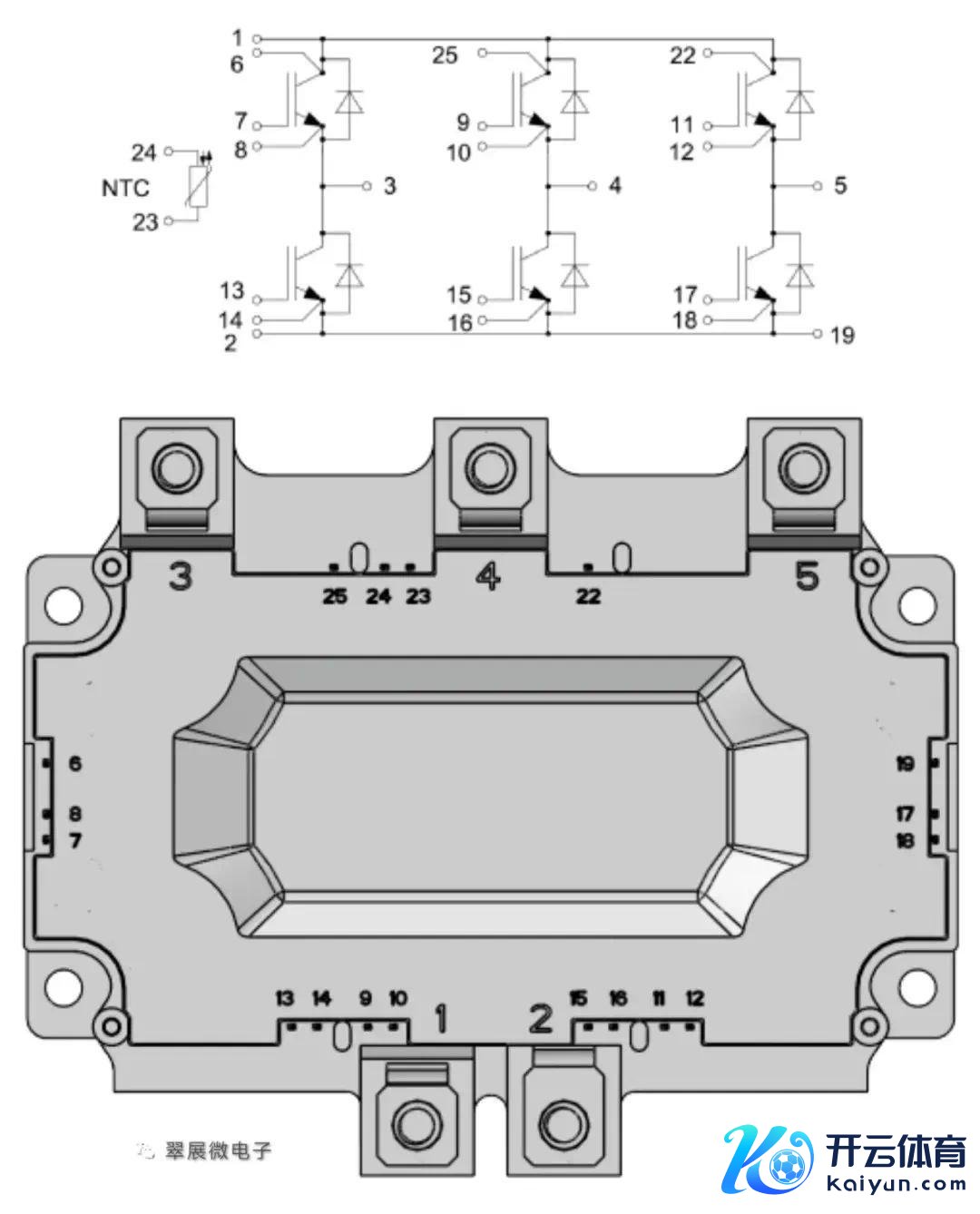 1是DC正,2是DC负;3,4,5是三相交流电的U、V、W接口;6,25,22是集电极的信号端子,7,9,11,13,15,17是门极信号端子;8,10,12,14,16,18是辐射极信号端子;19是DC负极信号端子;23,24是NTC热敏电阻端子。