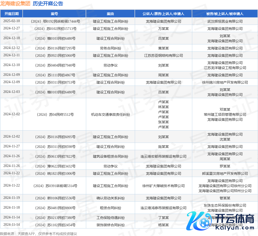 案号:(2024)豫0622民初3432号审理法院:淇县东说念主民法院案由:就业争议当事东说念主信息: 原告/上诉东说念主:龙海确立集团有限公司 被告/被上诉东说念主:罗某某开庭日历:2024年11月26日凭据统计,近一年内以龙海确立集团有限公司为当事东说念主的历史开庭公告有186则,其中案由为“确立工程施工公约纠纷”的公告以74则居首,其次为“确立工程公约纠纷”有24则,“生意公约纠纷”有11则。历史开庭公告(前20条)如下: