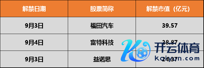 具体来看,福田汽车9月3日解禁14.29亿股,为定向增发机构配售股份;富特科技与益诺想区别在9月4日与9月3日解禁7881.86万股、6249.80万股,首发原鼓动限售股份,首发计谋配售股份。