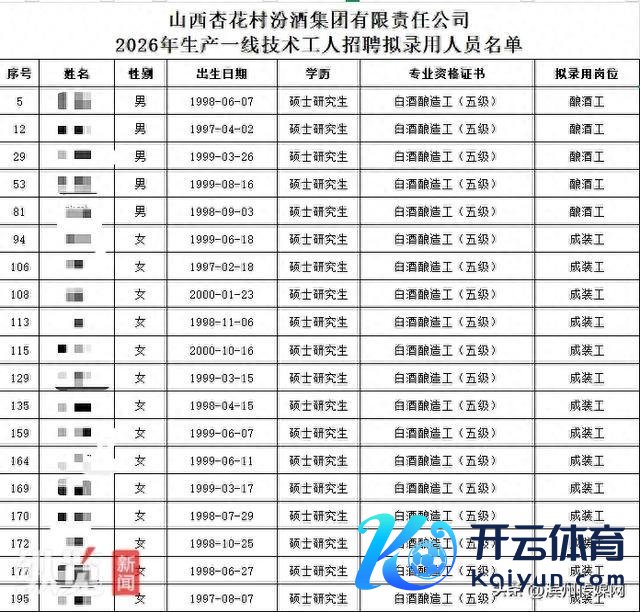 汾酒集团公示的2026年出产一线手艺工东说念主招聘拟委用东说念主员出现多名硕士(开头/公示截图)