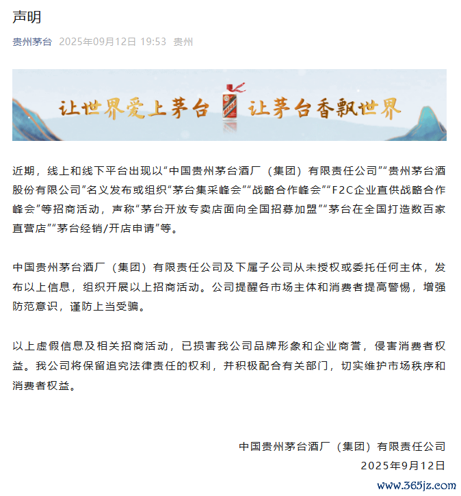 茅台集团:未授权或交付任何主体发布或组织“茅台集采峰会”等招商当作茅台集团:未授权或交付任何主体发布或组织“茅台集采峰会”等招商当作