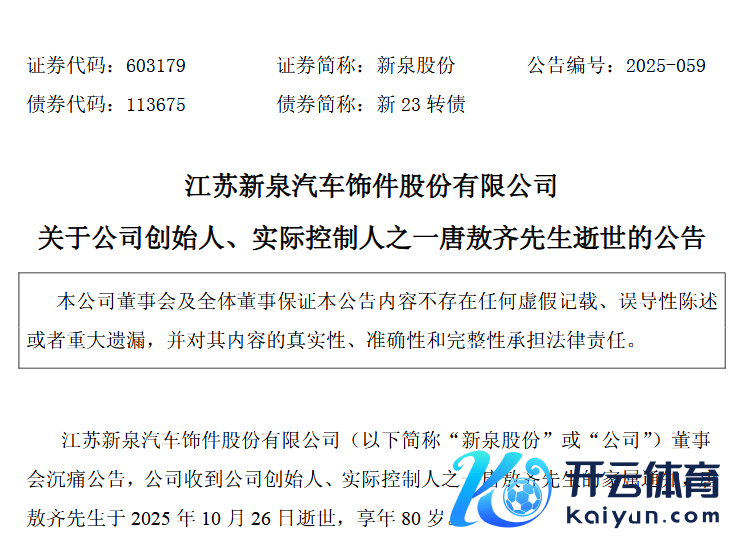 中新经纬10月27日电 江苏新泉汽车饰件股份有限公司(下称“新泉股份”)27日发布公告称,公司收到公司创举东说念主、骨子适度东说念主之一唐敖王人的家属示知,唐敖王人于2025年10月26日毕命,享年80岁。